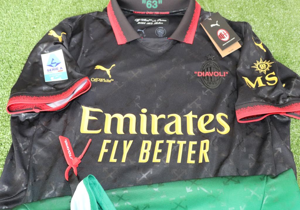 Edizione ufficiale con etichetta "Off-White c/o Puma 2025 A.C. Milan" e numerazione interna "63". Oggetto ideale per collezionisti e appassionati di memorabilia calcistica contemporanea.