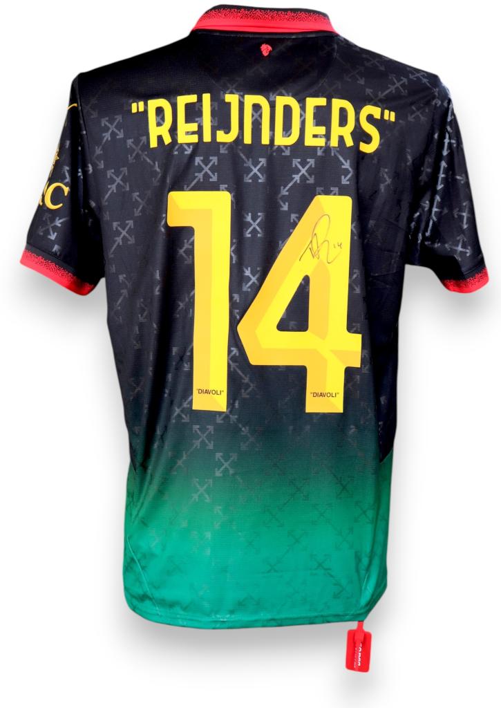 Sul petto troviamo lo sponsor Emirates Fly Better e la patch Serie A applicata sulla manica destra. Sul retro è presente il name set di Tijjani Reijnders (numero 14), autografato direttamente dal giocatore.