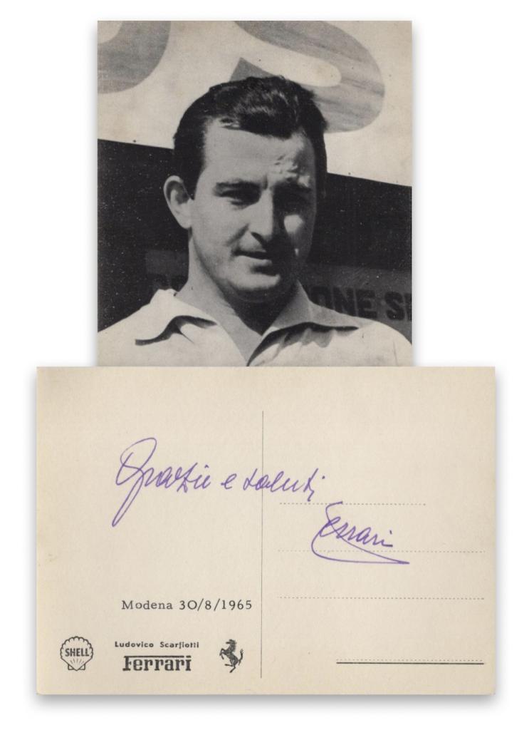 Autografo di Enzo Ferrari 1965 su cartolina Ludovico Scarfiotti