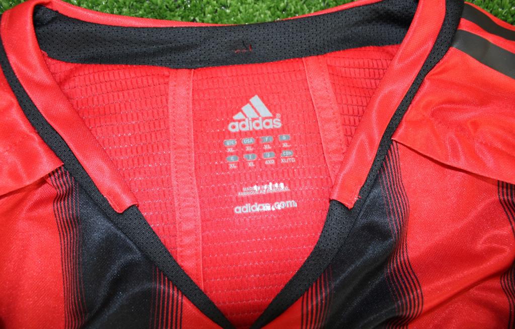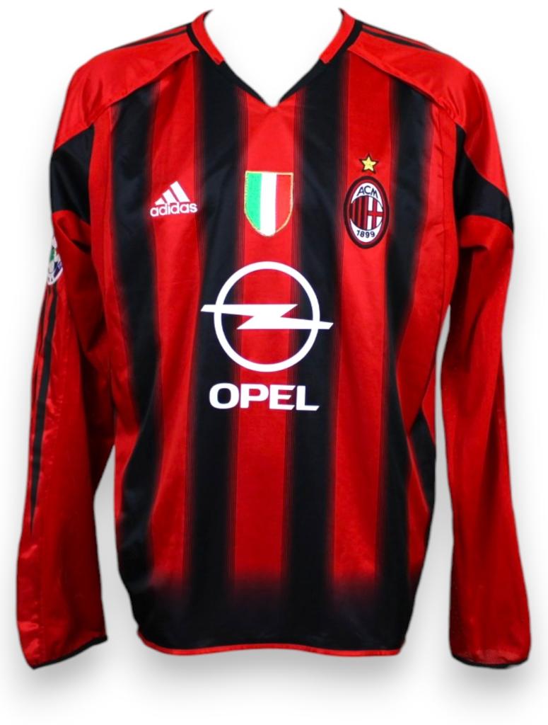 Maglia home del Milan stagione 2004-2005, versione player issued. Prodotta da Adidas riporta il design tradizionale con strisce verticali rosse e nere, colletto a girocollo e logo Adidas centrale.