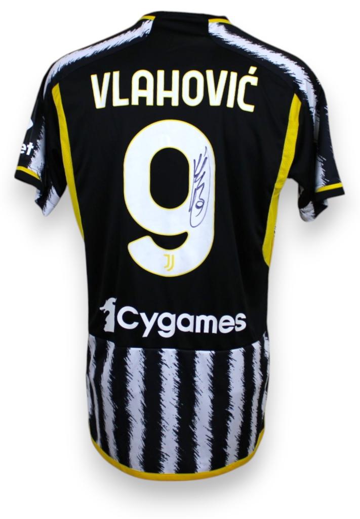 Maglia Juventus home 2023-2024 autografata dall'attaccante serbo Dusan Vlahovic, versione store. Iconica e perfetta da collezione.