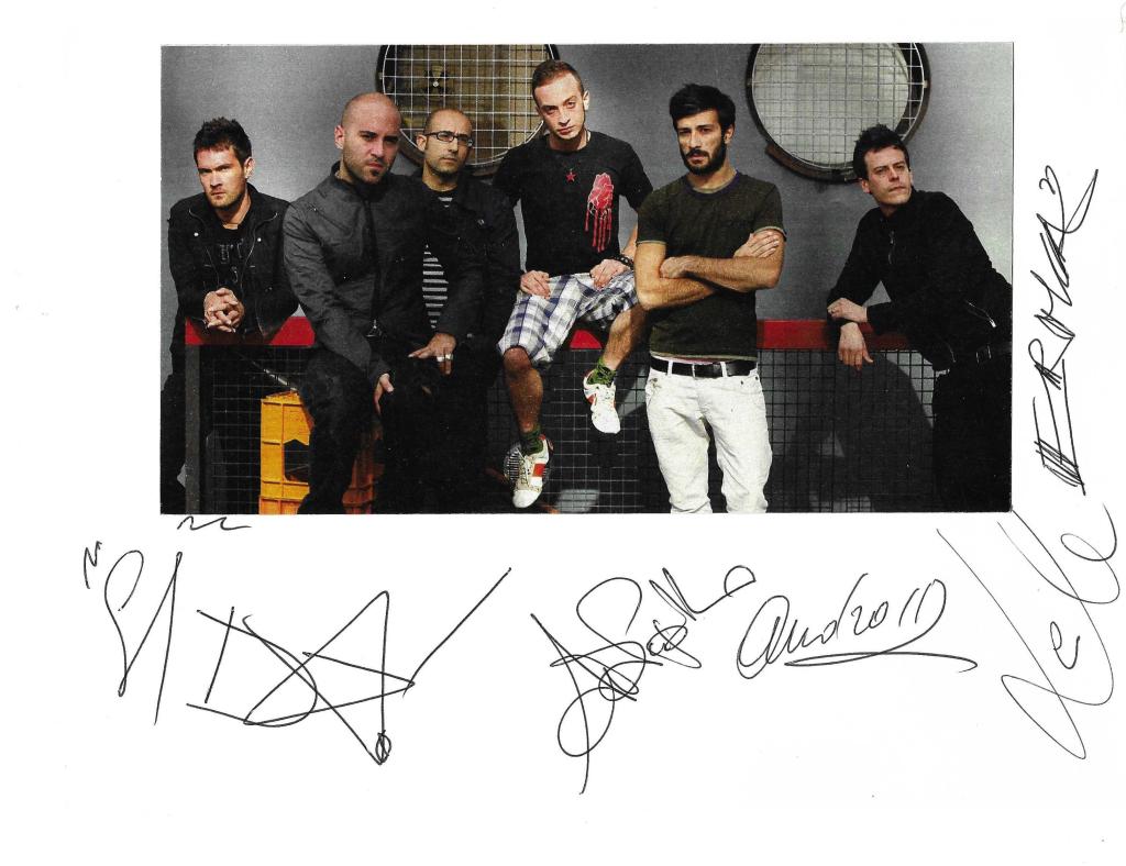 Foto autografata dei Negramaro con firma di tutti i membri. Ritratto di gruppo contemporaneo da collezione.