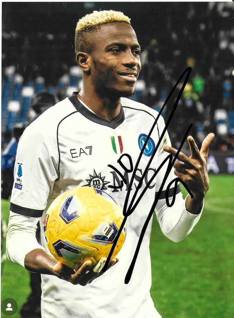 Foto autografata di Victor Osimhen con maglia Napoli scudettata. Firma nera e pallone in mano. Pezzo da collezionE.