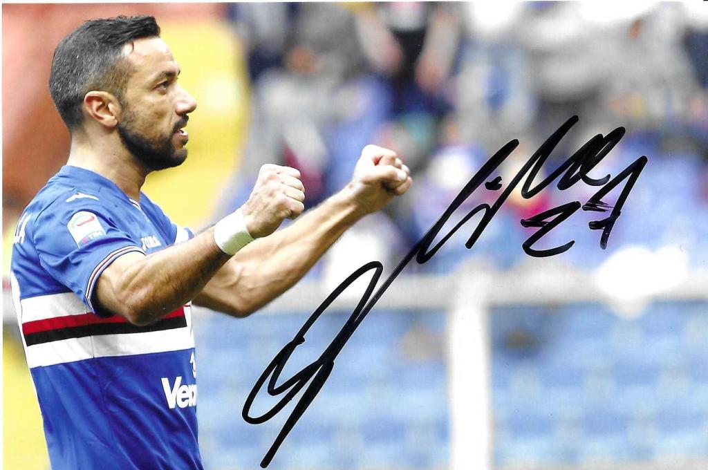 Scatto autografato di Fabio Quagliarella con la Samp. Firma nera ben visibile. Pezzo iconico per i tifosi blucerchiati.