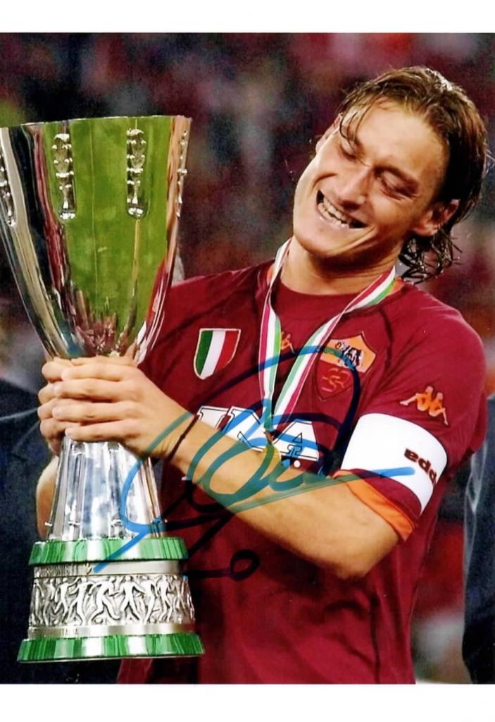 Fotografia autografata di Francesco Totti con la Supercoppa Italiana, simbolo eterno della Roma e leggenda del calcio mondiale.