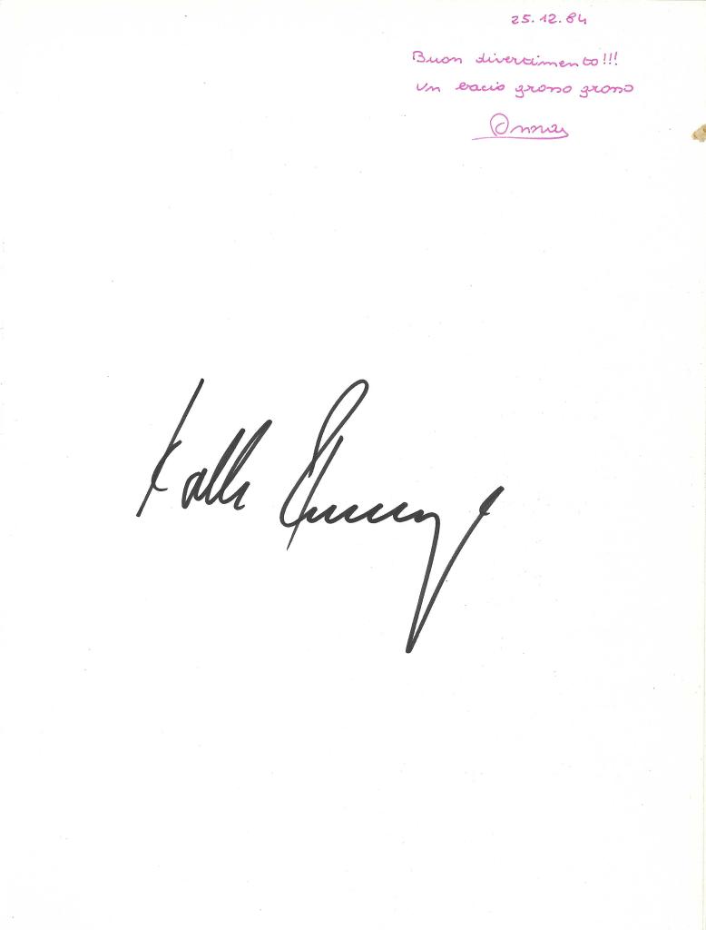 La fotografia autografata è contenuta all’interno del libro e raffigura una pagina bianca con firma nitida a pennarello nero dell’ex attaccante. In alto a destra, una dedica manoscritta in rosso datata “25.12.84”: “Buon divertimento!!! Un bacio grosso grosso. Anna”.