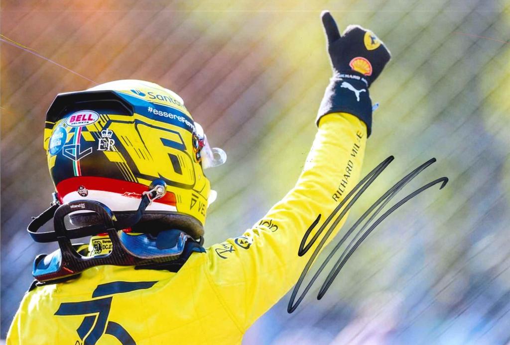 Fotografia a colori che ritrae Charles Leclerc di spalle, immortalato mentre alza il pollice in segno di vittoria o saluto. Il pilota indossa la speciale tuta gialla della Scuderia Ferrari, abbinata al casco con numero 16 ben visibile, richiamo alla livrea celebrativa utilizzata in occasione del Gran Premio d’Italia. Sul lato destro della fotografia compare l’autografo originale di Leclerc, apposto in pennarello nero.