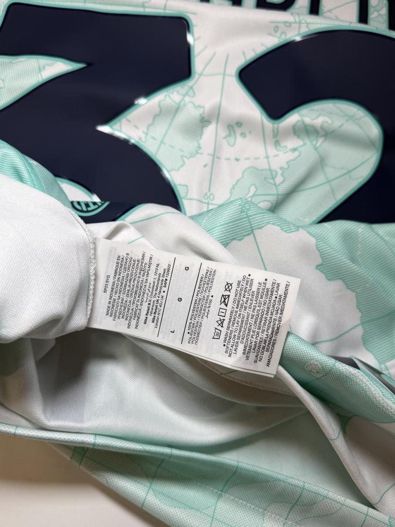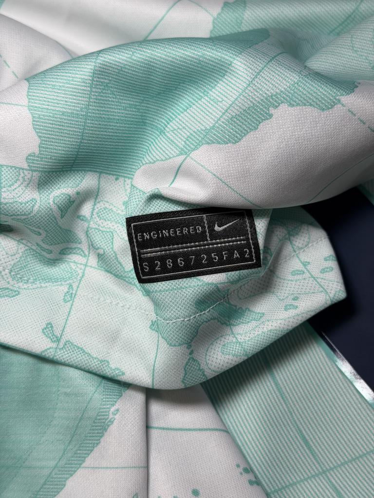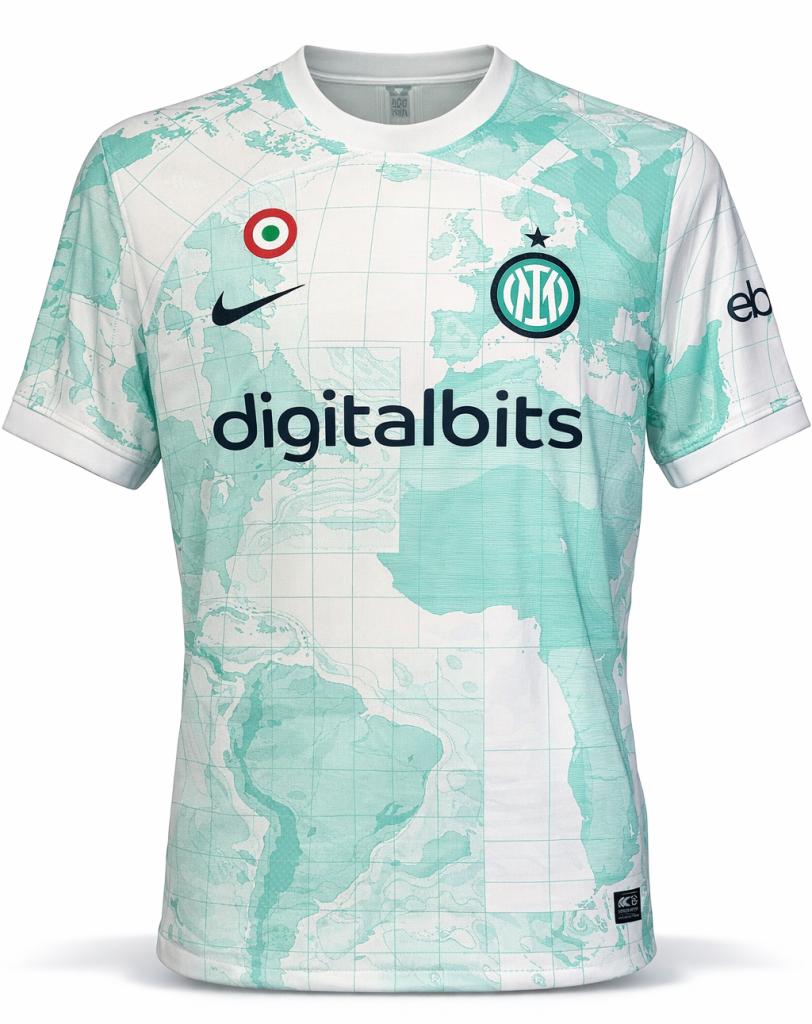 Realizzata da Nike nella versione Away, si presenta su base bianca con grafica a mappamondo in tonalità verde acqua estesa su tutta la superficie, includendo busto e maniche. Sul petto sono applicati lo sponsor tecnico e lo stemma del club, posizionato in corrispondenza dell’area geografica di Milano.