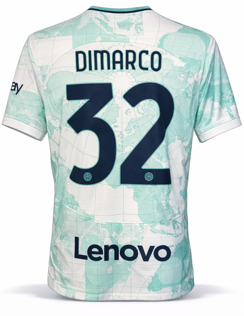 Maglia versione store dell’Inter di Dimarco nella stagione 2022/23 versione "mappamondo" - pattern planisferico map of the world.