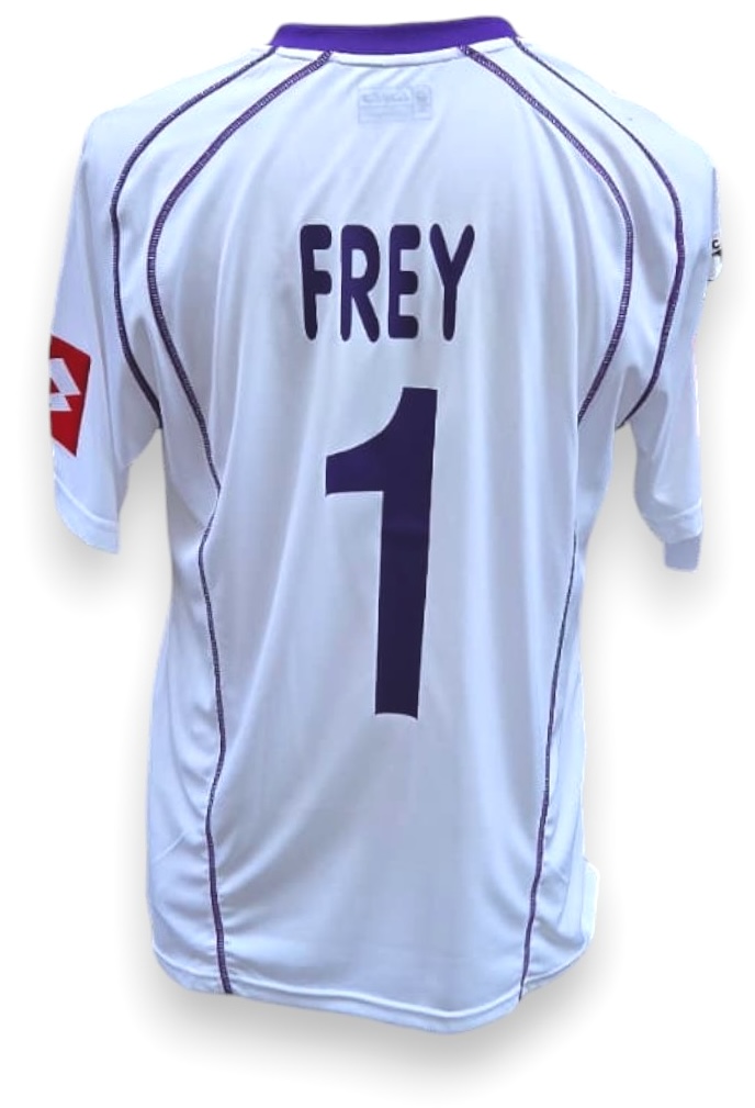 Maglia Fiorentina versione Portiere player issued con personalizzazione Frey 1, modello ufficiale Lotto. Il colore è prevalentemente bianco con dettagli viola a contrasto. Sulla manica è presente la patch Serie A TIM.