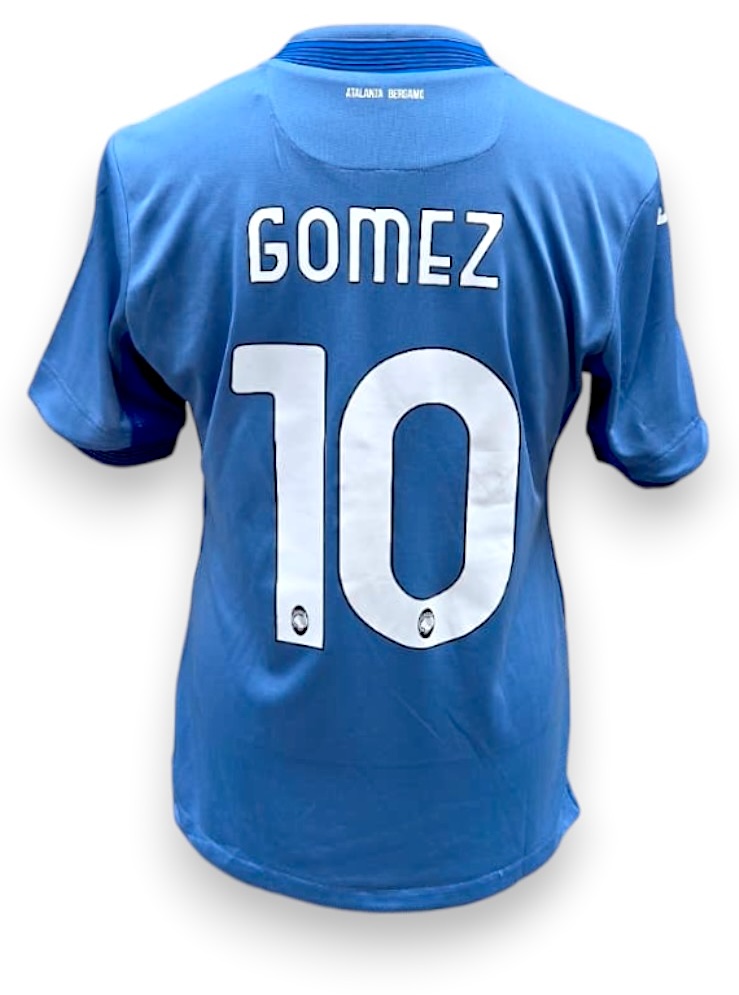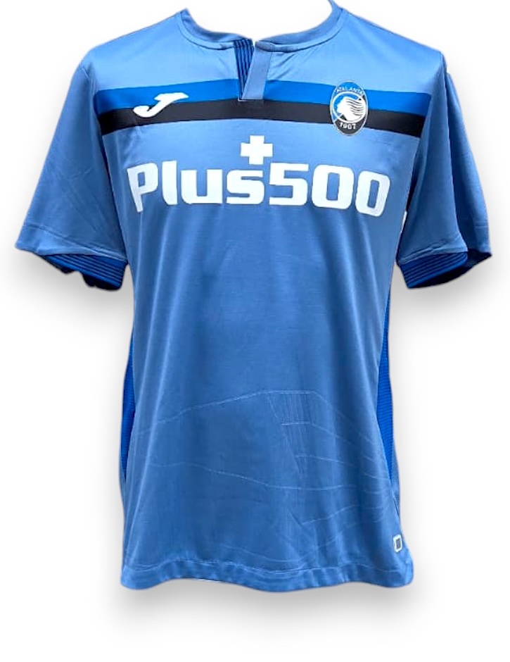 Maglia Atalanta Third 2020/21, Joma blu-azzurra con nastro nero e sponsor Plus500, versione store con personalizzazione Gómez #10.