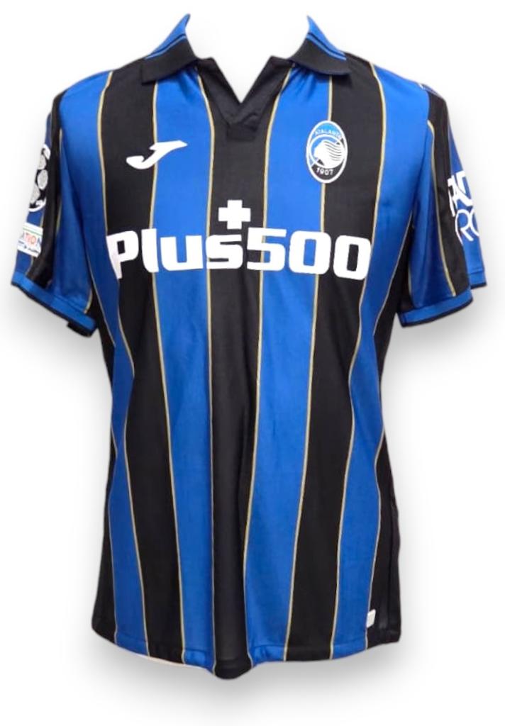 Maglia Atalanta home 2021/22 versione store con personalizzazione Ilicic 72 . Il fronte presenta le classiche strisce verticali nero-azzurre arricchite da sottili filetti dorati tra di esse, tipici del modello Joma di quell'anno.