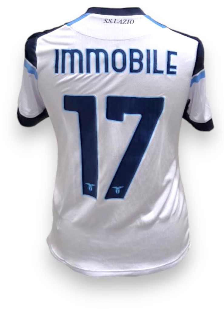 Sul retro è stampato il nome “IMMOBILE” e il numero 17 in colorazione contrastante, con un bordo blu visibile. Sopra il colletto, internamente, appare la dicitura “S.S. Lazio” come elemento distintivo del kit.