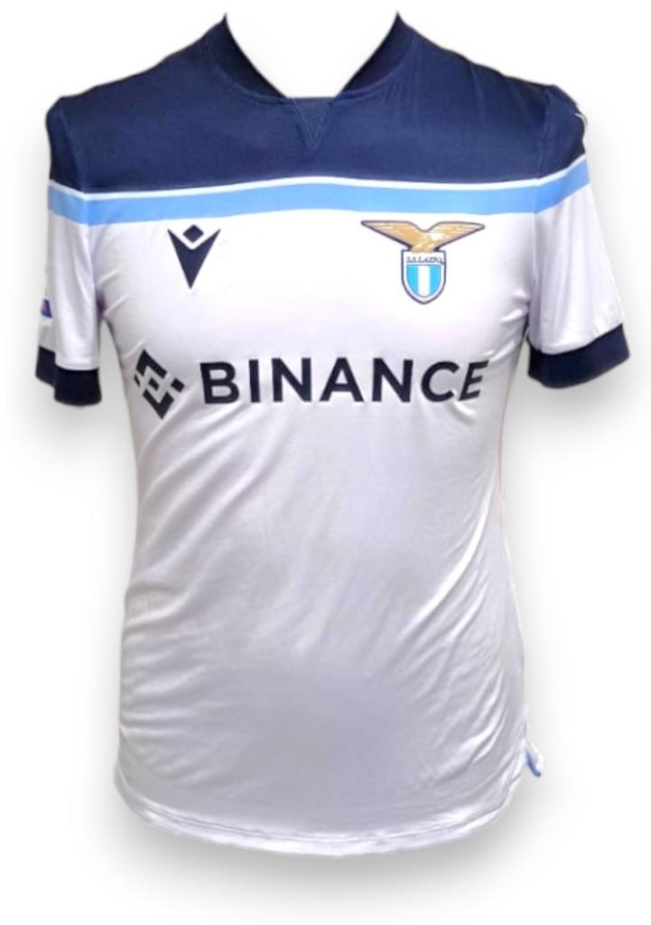 Sul petto trovi lo stemma SS Lazio, il logo Macron e lo sponsor Binance in posizione centrale. Sulle maniche è applicata la patch Serie A 2021-22.
