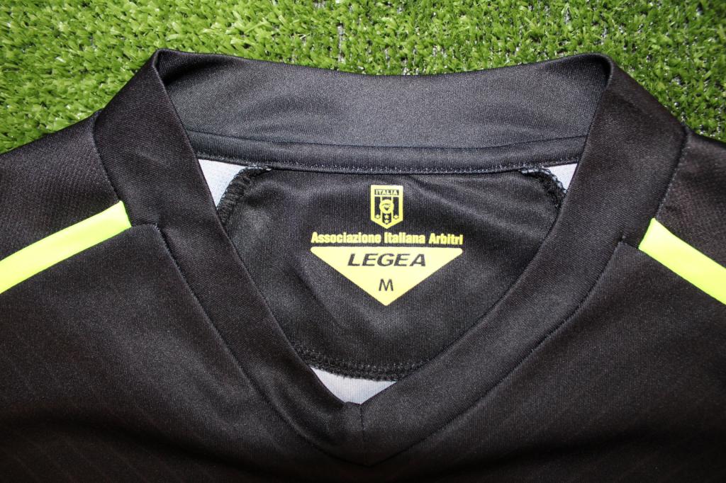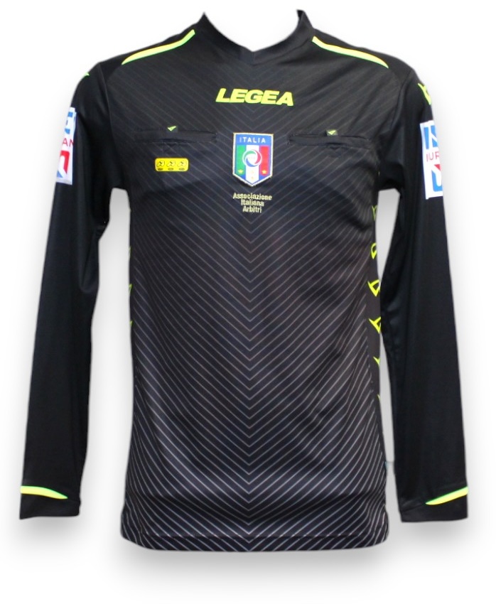 Maglia arbitro Legea / AIA nera manica lunga, con stemma FIGC, patch “tre fischietti” e dettagli gialli in tessuto tecnico. Versione store.