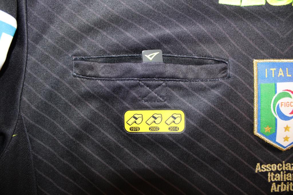 Maglia da arbitro ufficiale Legea per l’AIA / FIGC, in taglia M. Il colore principale è il nero scuro, con sottili righe a spina di pesce tono-su-tono e dettagli in giallo/neon sui bordi delle maniche e sulle spalle. Sul petto è ricamato lo stemma dell’Associazione Italiana Arbitri con scritta “Associazione Italiana Arbitri”, e accanto compare una patch con tre fischietti (1978 · 2002 · 2014). Sulla parte posteriore è stampato in grande “LEGEA” in giallo. Maniche lunghe, versione store.
