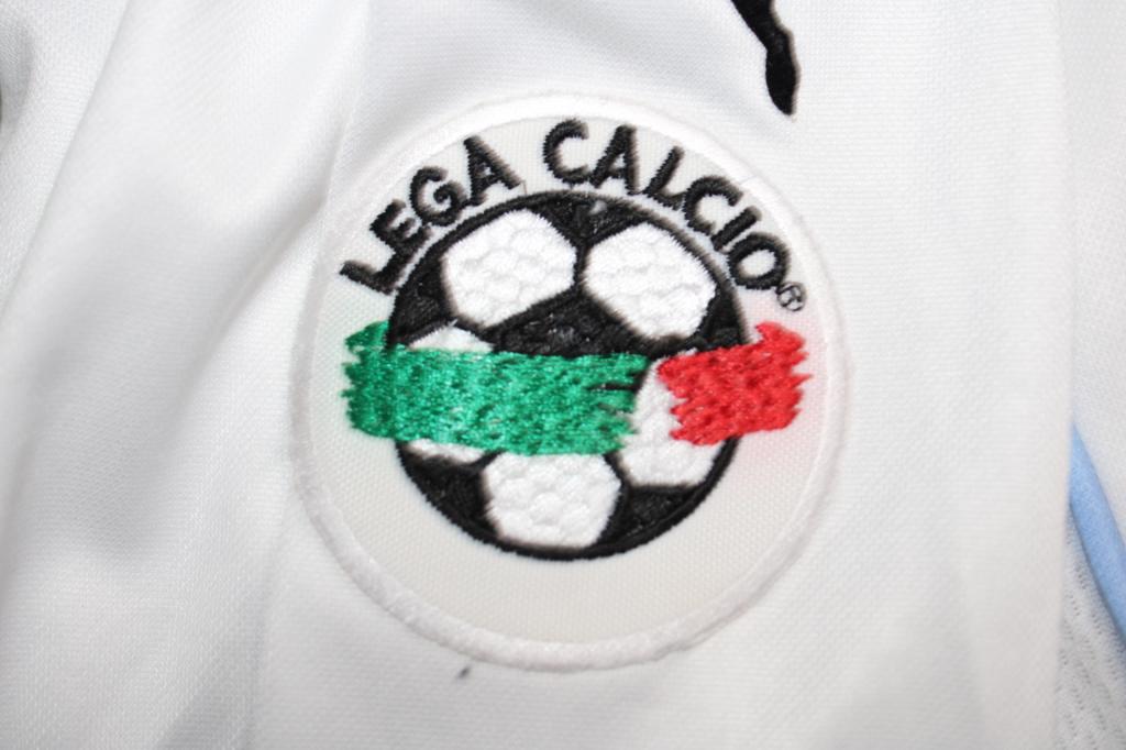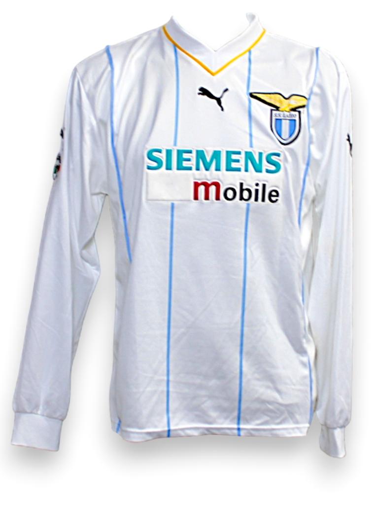 Maglia a fondo bianco, con sottili righe verticali azzurre che percorrono la maglia. Colletto a “V / scollo a punta” con bordo giallo, che aggiunge un contrasto cromatico. Sponsor “Siemens mobile” stampato in rilievo centrale e ben visibile che domina il design frontale. Maglia player issued con personalizzazione CESAR 3 e maniche lunghe con patch ufficiale Serie A.