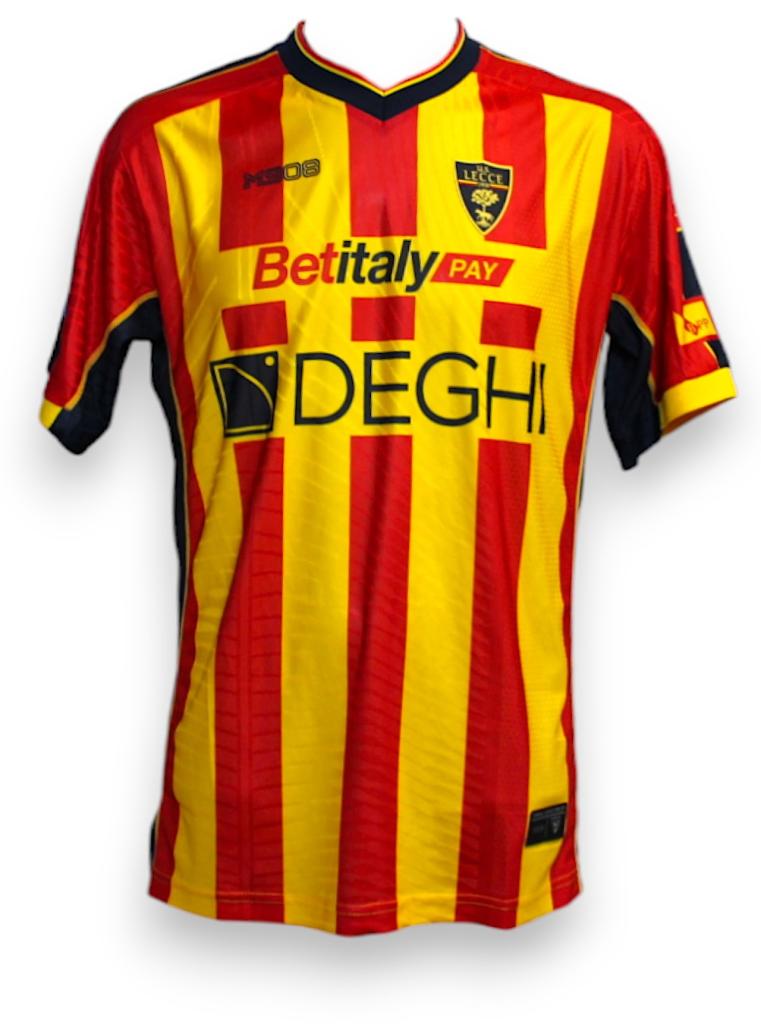 Maglia home del Lecce 2024/25, con stampa frontale “BetItaly Pay” sopra “DEGHI”. Player Issued con personalizzazione A. Rebic con il numero 3 in grande. Il colletto è a V con profilo scuro, e le maniche mostrano dettagli tonali che richiamano i colori sociali. L’interno del colletto ha un’etichetta con la dicitura “è la maglia di un intero popolo”, sulla manica è applicata la patch ufficiale di Serie A.