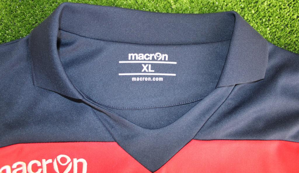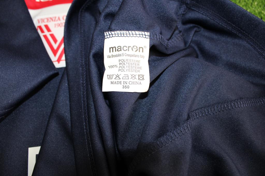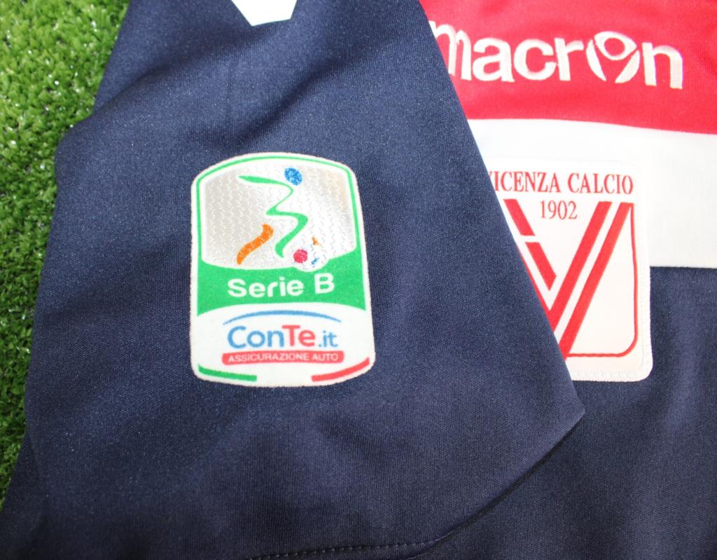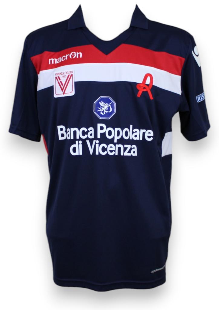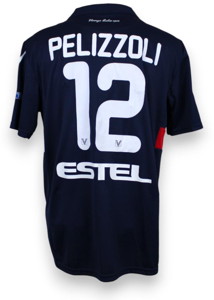 Maglia blu del Vicenza, realizzata da Macron con fascia orizzontale rossa/bianca, player issued con personalizzazione Pelizzoli 12.