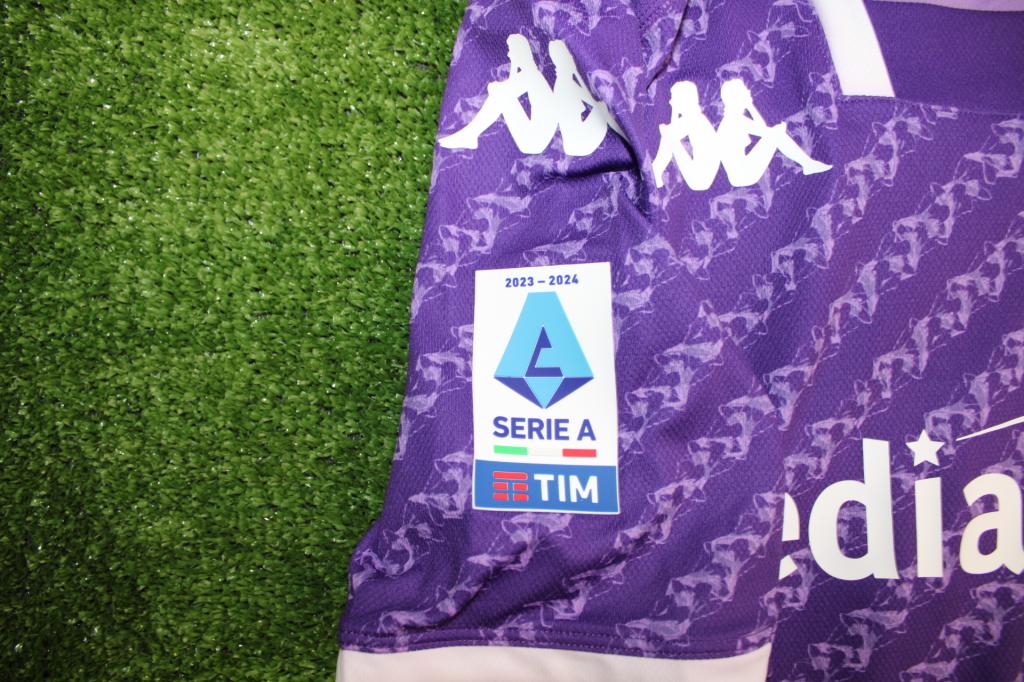 Maglia della Fiorentina Home della stagione 2023/24, versione store con personalizzazione M. Lopez 8 e patch della Serie A.
