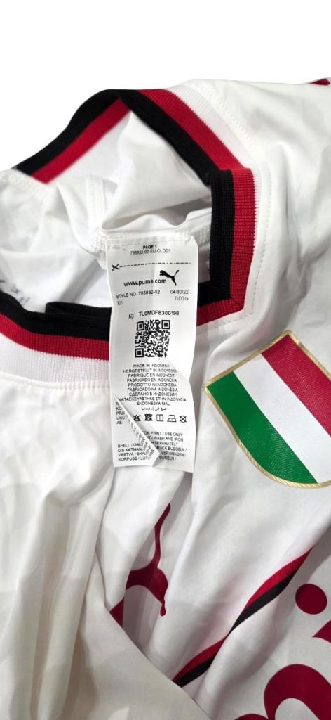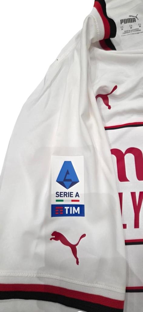 La maglia Away del Milan 2022/23 prodotta da Puma si distingue per il design elegante in bianco con dettagli rossoneri e una serie di sottili righe orizzontali rosse sul fronte, che richiamano la tradizione grafica del club. Sul petto trovano posto lo Scudetto tricolore, simbolo del titolo conquistato nella stagione precedente, lo stemma societario con stella celebrativa e lo sponsor tecnico Puma, mentre al centro campeggia la sponsorizzazione “Emirates Fly Better”. Sul retro compare la personalizzazione ufficiale Messias Jr 30, completata in basso dal secondo sponsor “Wefox”. La patch ufficiale della Serie A è applicata sulla manica.