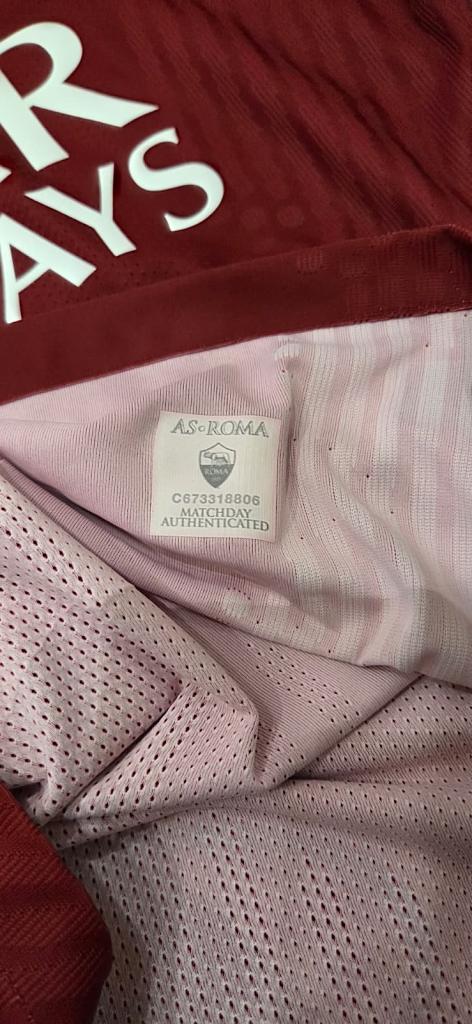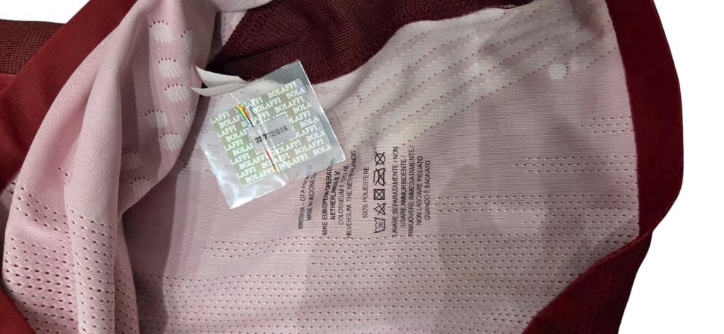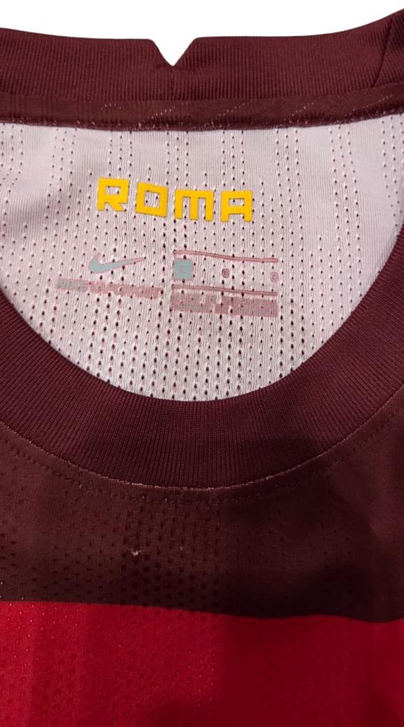 La maglia si distingue per la tecnologia Nike VaporKnit, con tessuto leggero e traspirante, dettagli traforati e taglio slim fit, pensata per garantire prestazioni ottimali in campo. All’interno del collo compare la scritta “Roma” in giallo, mentre una speciale etichetta di autenticità è cucita sul tessuto interno. Versione match preparata, non in vendita commerciale, destinata esclusivamente alla squadra.