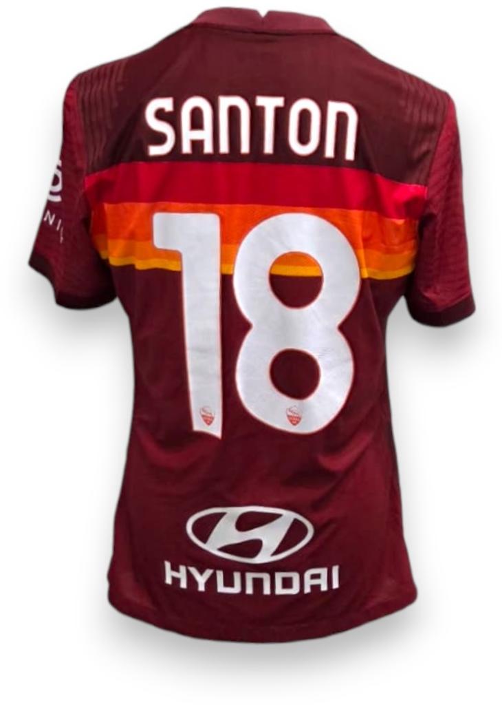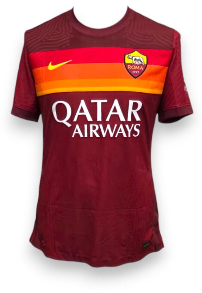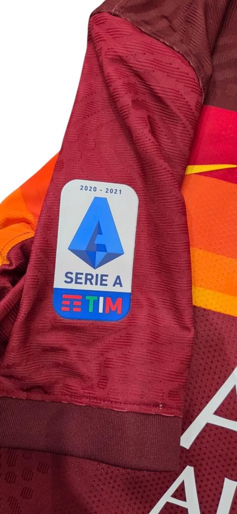 Maglia home della Roma stagione 2020/21, realizzata da Nike nella versione Player Issued e preparata per Davide Santon con numero 18 e nome applicati sul retro. Il design si ispira allo storico stile Anni ’80, con base granata e fascia orizzontale centrale sfumata in giallo e arancio, accompagnata dal logo Nike in giallo e dallo stemma del club giallorosso sul petto. Il main sponsor Qatar Airways campeggia al centro, mentre sul retro è presente il marchio Hyundai in bianco. Sulla manica destra è applicata la patch ufficiale Serie A TIM 2020/21.