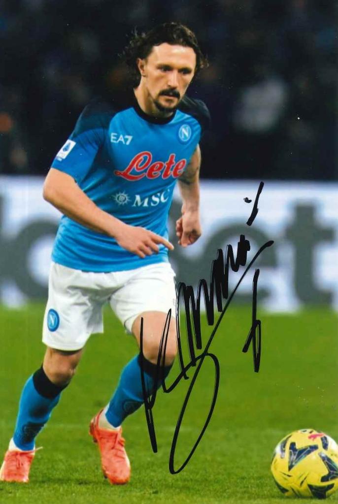 La fotografia autografata ritrae Mario Rui mentre corre sul campo con la maglia azzurra del Napoli, con lo sguardo rivolto verso l’azione. Ha il pallone vicino ai piedi e la postura suggerisce movimento deciso e concentrazione. Il petto mostra lo sponsor “Lete” e il logo del club, mentre lo sfondo dello stadio è leggermente sfocato, mettendo in rilievo la figura del giocatore. La firma in pennarello nero percorre diagonalmente la parte inferiore destra, sovrapponendosi alla gamba e al prato.