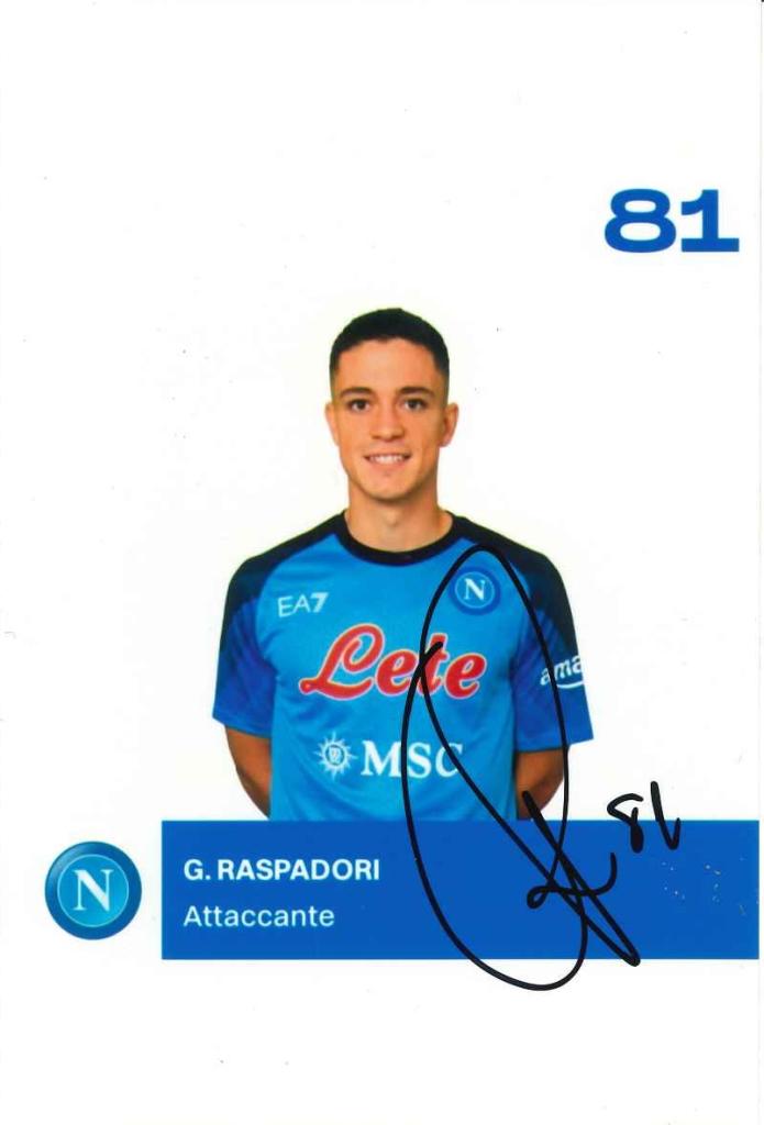 Autografo di Giacomo Raspadori su fotografia a colori che lo ritrae in posa frontale con la maglia del Napoli su sfondo bianco con numero 81 visibile, firmata sul fronte.