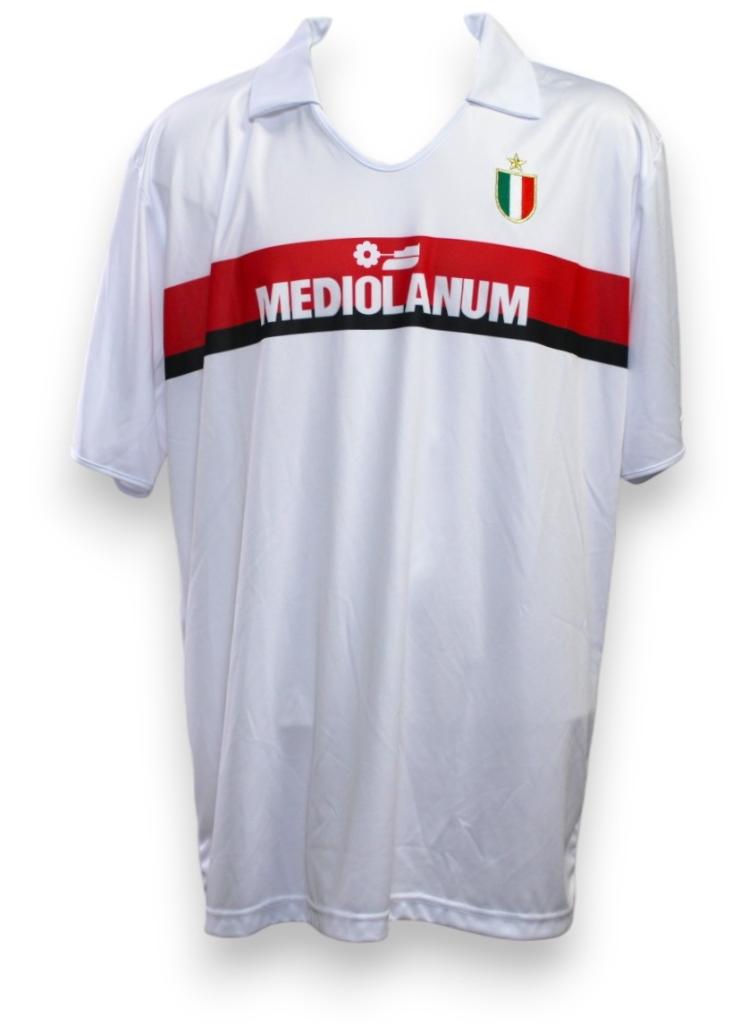 Maglia da calcio Away del Milan relativa alla stagione 1988/1989, questa è una versione store replica moderna della maglia di quell'anno. Con sponsor tecnico adidas e sponsor commerciale Mediolanum in evidenza sulla fascia rossa orizzontale attraversata da un profilo nero. Sul petto è cucito lo scudetto tricolore che celebra il titolo nazionale conquistato, mentre sul retro è presente il numero 6 in rosso bordato di bianco, accompagnato dall’autografo originale del capitano Franco Baresi, autentica leggenda rossonera.