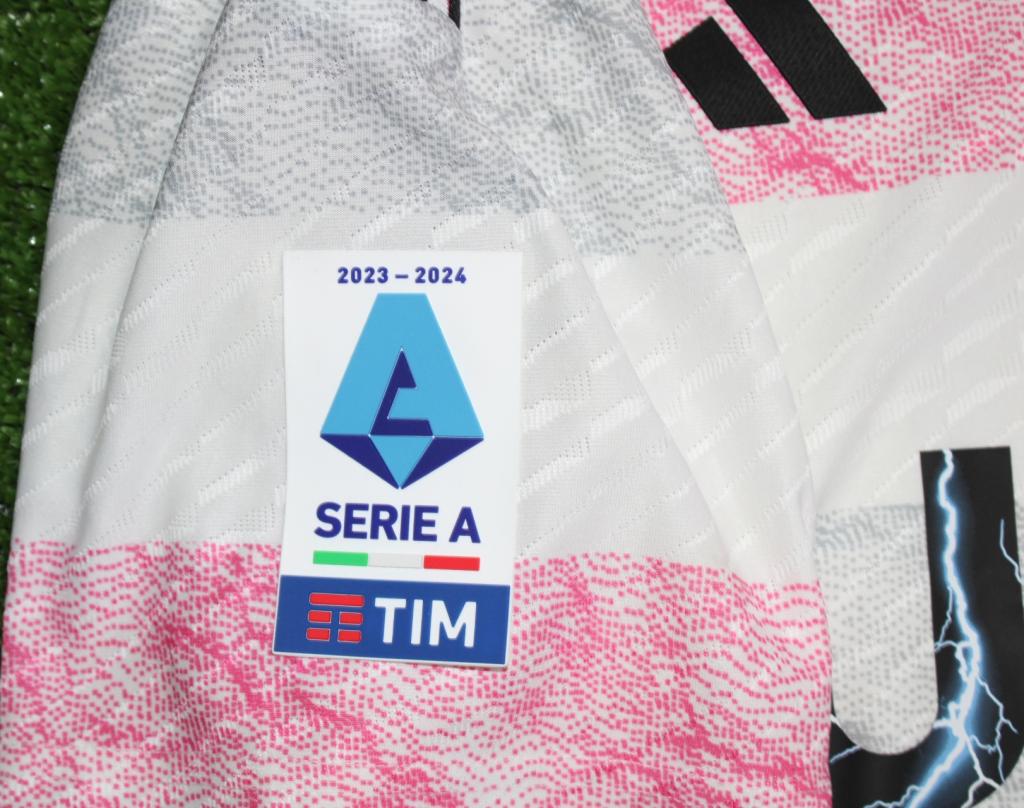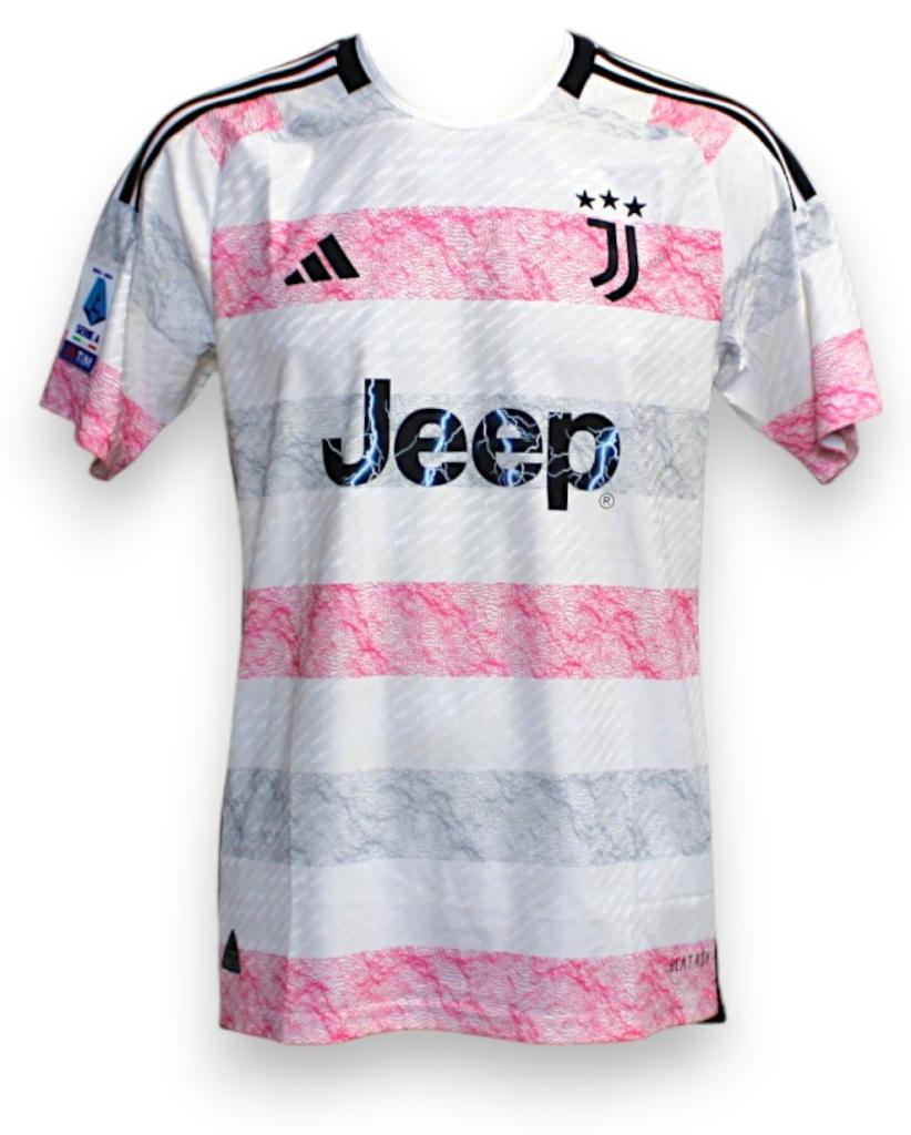 Maglia da calcio Away della Juventus per la stagione 2023/2024, realizzata da adidas nella versione Store. Il design presenta base bianca con bande orizzontali effetto marmorizzato in rosa e grigio, completata da colletto e dettagli neri a contrasto. Sul petto sono applicati lo stemma del club con le tre stelle dorate, il logo adidas e lo sponsor commerciale Jeep, mentre sulla manica destra compare la patch ufficiale della Serie A TIM 2023/24.