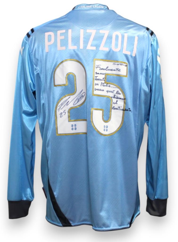 Maglia Away Cagliari 2010/11. Player Issued, manica lunga, nome e numero 25 Pelizzoli, con dedica autografata dal calciatore sul retro.