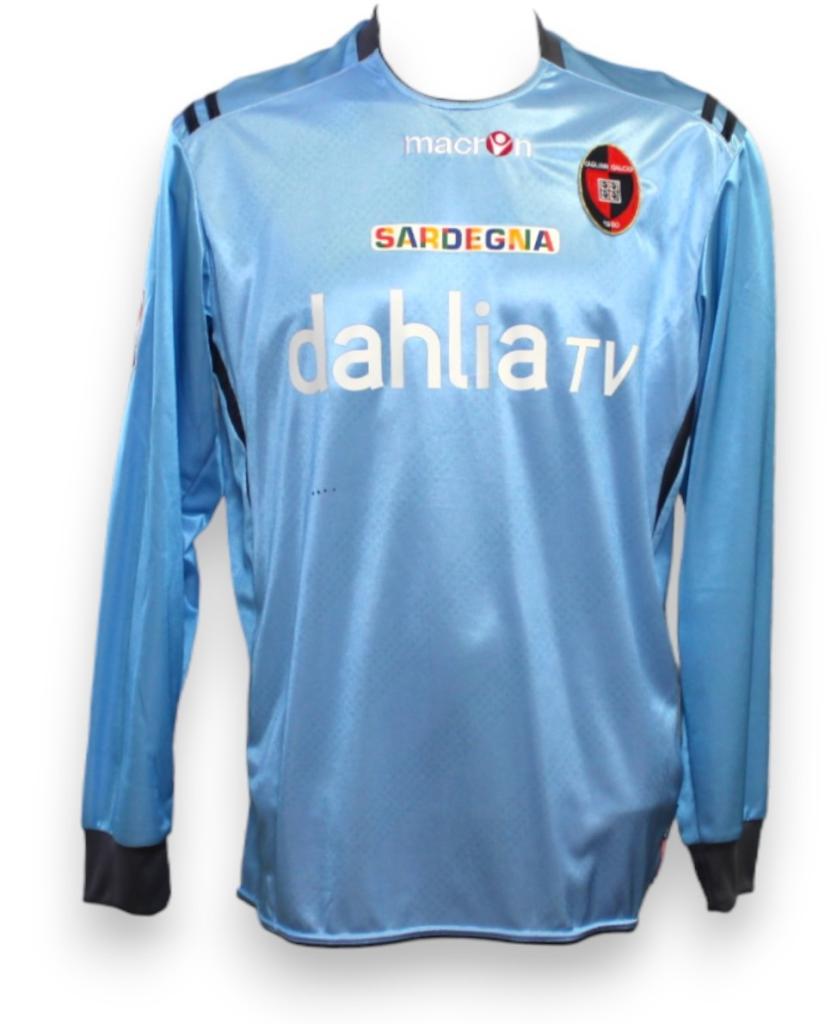 Maglia da portiere Away del Cagliari utilizzata nella stagione 2010/2011, realizzata da Macron nella versione Player Issued a manica lunga. Il design presenta base azzurra con inserti neri su colletto e polsini, sponsor Dahlia TV al centro e scritta Sardegna multicolore sul petto. Sul lato cuore è cucito lo stemma societario, mentre sulla manica destra è applicata la patch ufficiale della Serie A TIM.