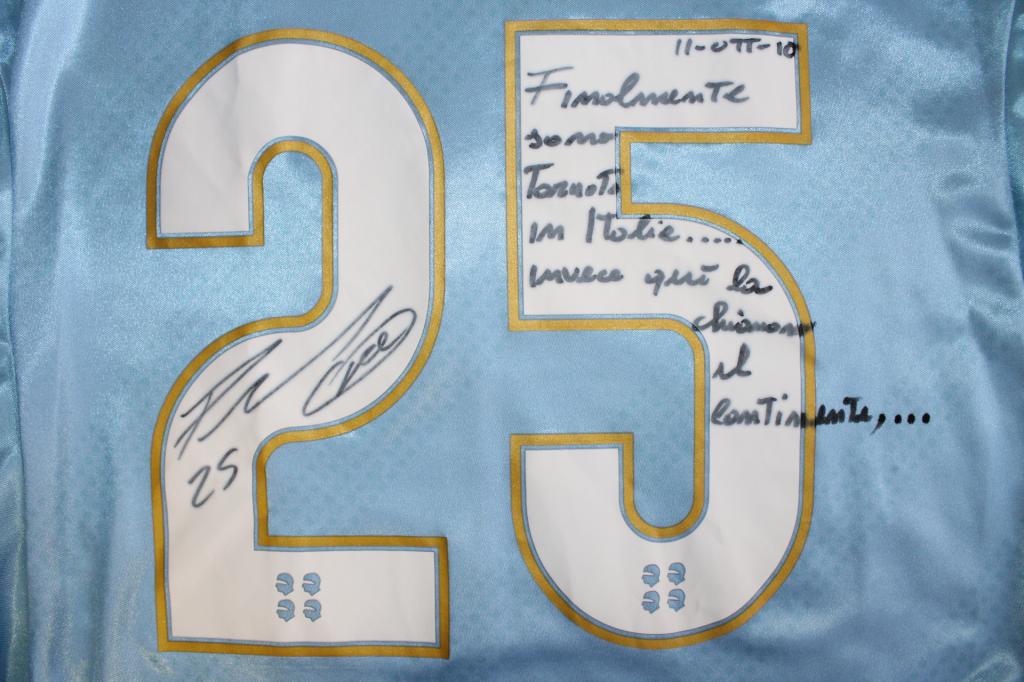 Il retro è personalizzato con nome Pelizzoli e numero 25, entrambi ufficiali da gara, arricchiti dall’autografo originale del portiere accompagnato da una lunga dedica manoscritta e datata 11/10/2010, dettaglio che rende questa maglia un esemplare unico.