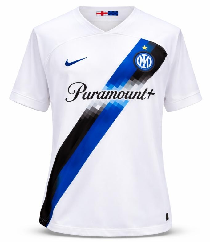 Realizzata da Nike nella versione Away, presenta una base bianca con una banda diagonale digitale nei toni del nero e del blu, elemento distintivo del design della stagione. Sul petto sono applicati il logo Nike, lo stemma dell’Inter con stella e lo sponsor commerciale Paramount+, mentre sulle maniche sono presenti le patch UEFA Champions League.