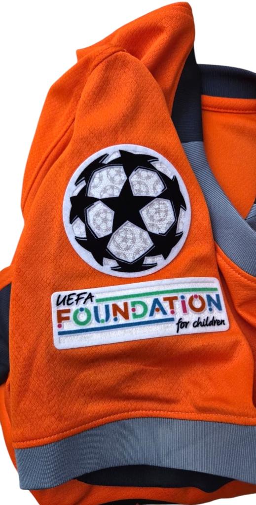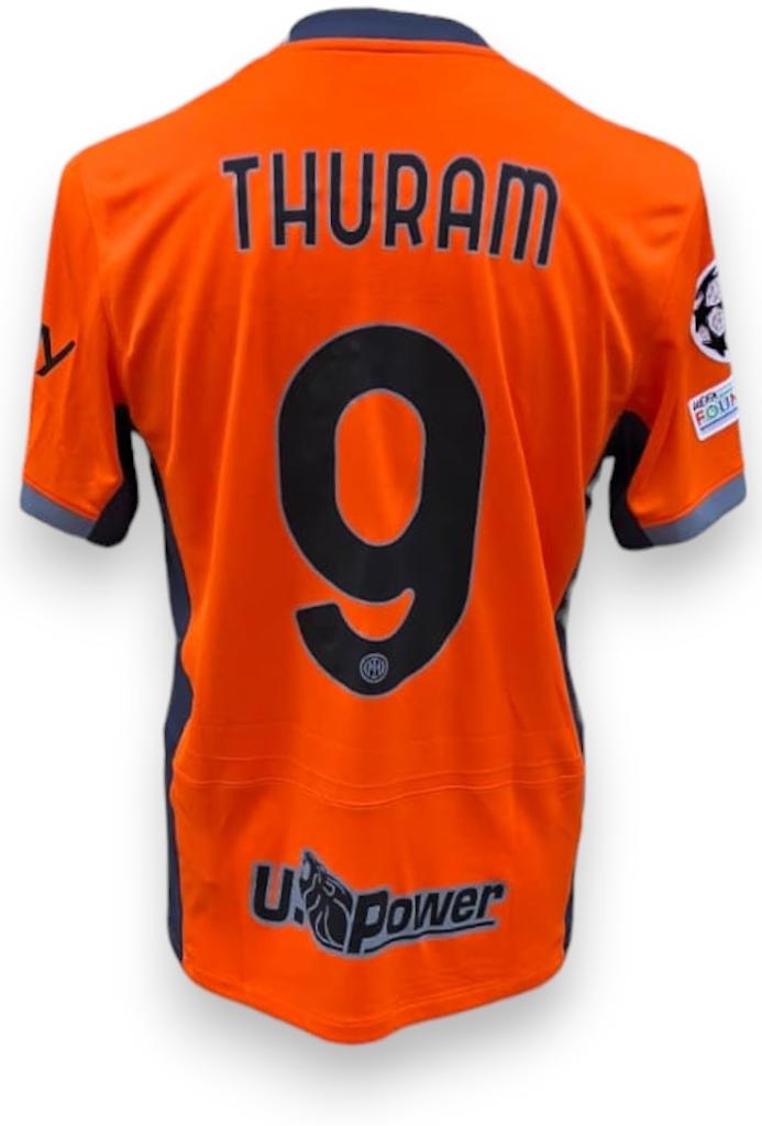 Maglia arancione dell’Inter 2023/24, versione store, personalizzata con Thuram e il numero 9. Patch UCL e UEFA Foundation sulle maniche.