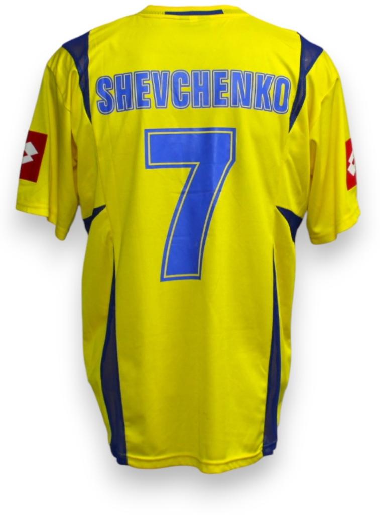 Maglia home Ucraina 2004/06 realizzata da Lotto, versione Store gialla con dettagli blu e nameset Shevchenko 7.