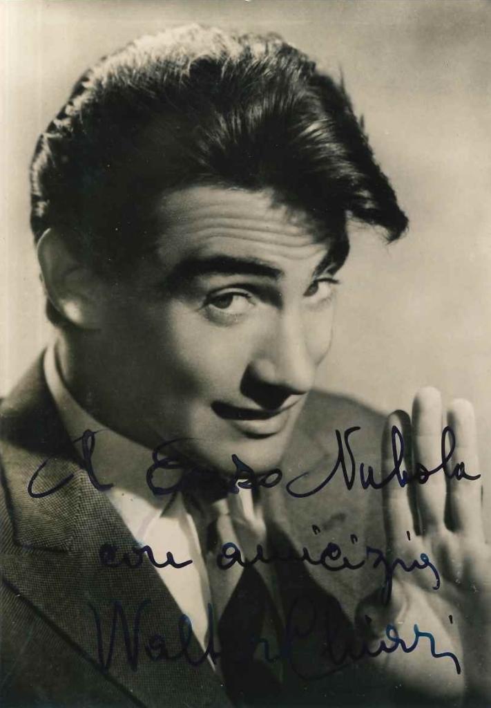 Autografo su fotografia di Walter Chiari in bianco e nero d’epoca con ritratto dell'autore in primo piano, ripreso con posa elegante e sguardo diretto.