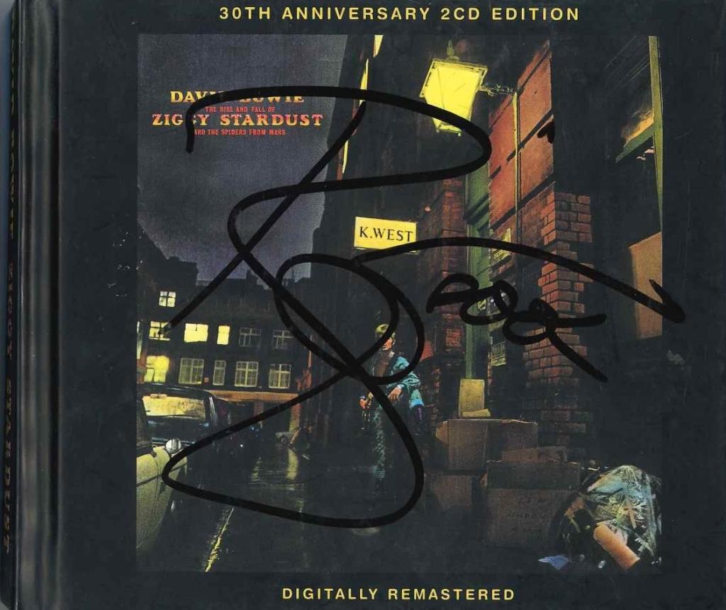 Rarissimo autografo di David Bowie su copertina del CD The Rise and Fall of Ziggy Stardust and the Spiders from Mars, nella sua pregiatissima edizione Anniversario del 2012, rimasterizzata da Emi/Parlophone in occasione del 40° anniversario dell'album.