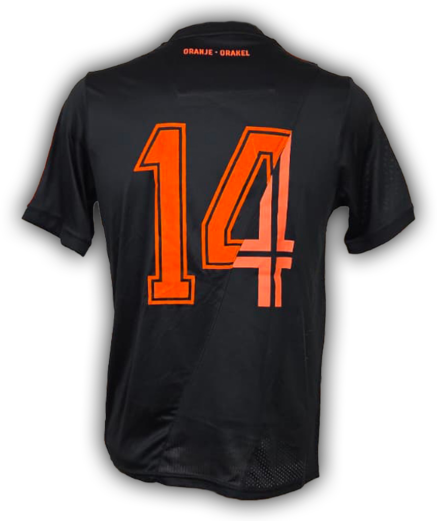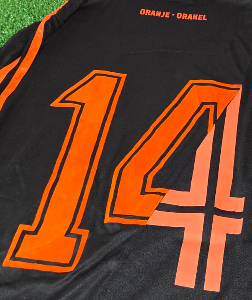 Maglia nera della Nazionale Olandese celebrativa Cruyff, elegante base nera con dettagli arancioni e iconico leone Oranje.