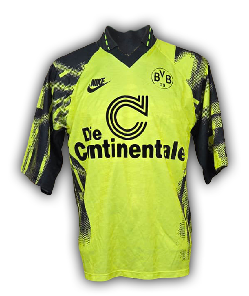 Maglia home del Borussia Dortmund stagione 1992/93, iconico giallo fluo con inserti neri e sponsor Die Continentale.