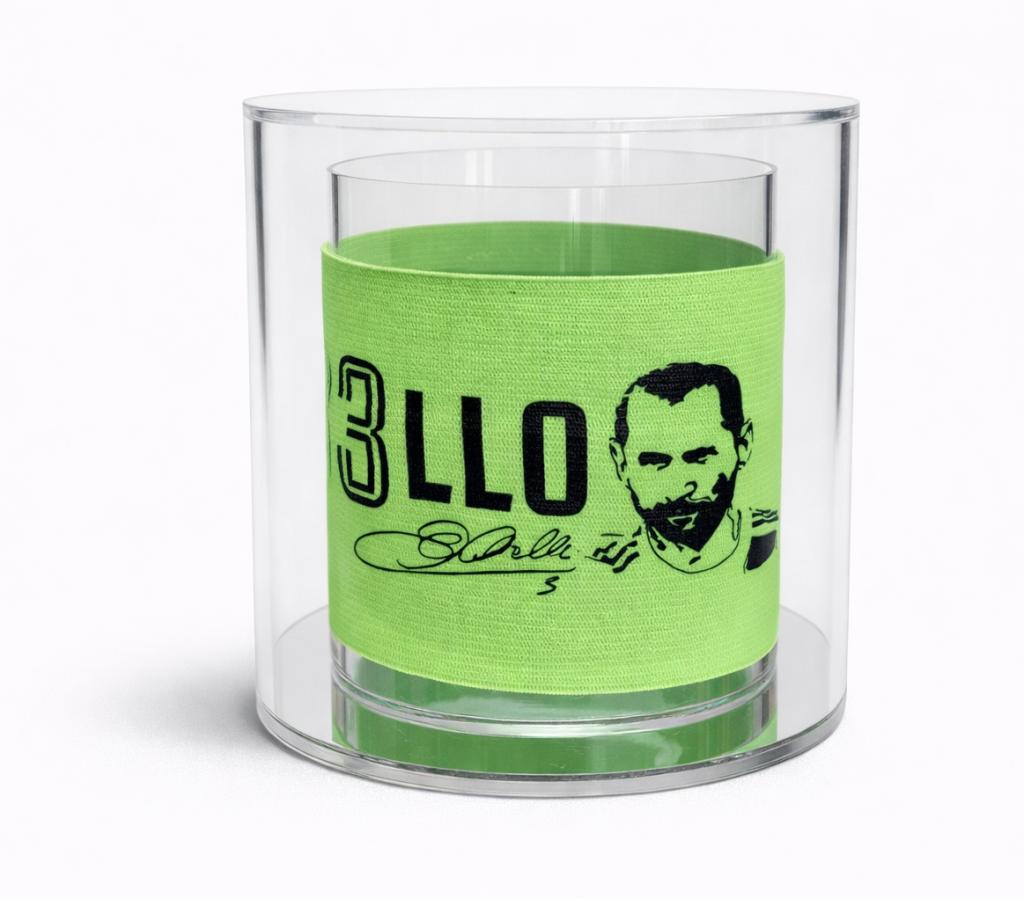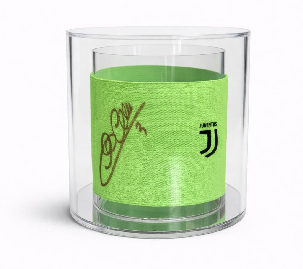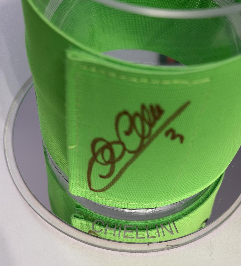 La fascia, in versione celebrativa con grafica dedicata al difensore bianconero (“Chi3llo”), rappresenta uno degli elementi simbolo della leadership in campo. L’autografo è apposto direttamente sulla fascia da capitano, rendendo l’oggetto particolarmente rappresentativo del ruolo ricoperto da Chiellini come capitano.