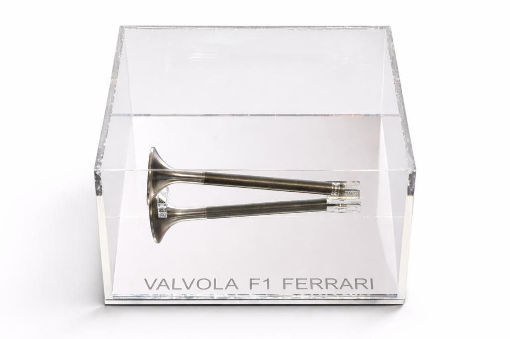 Valvola originale di motore Ferrari Formula 1, proveniente dall’epoca di Michael Schumacher (anni 2000), conservata in teca espositiva dedicata.