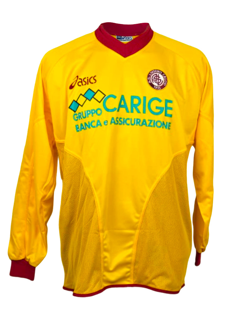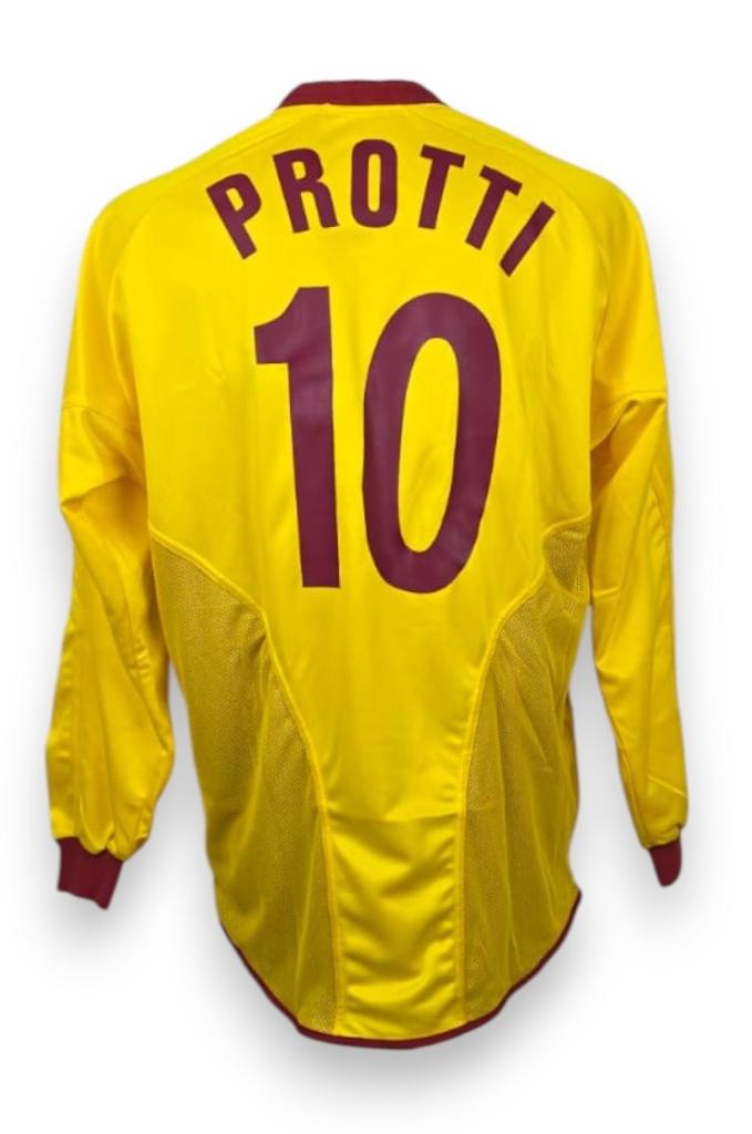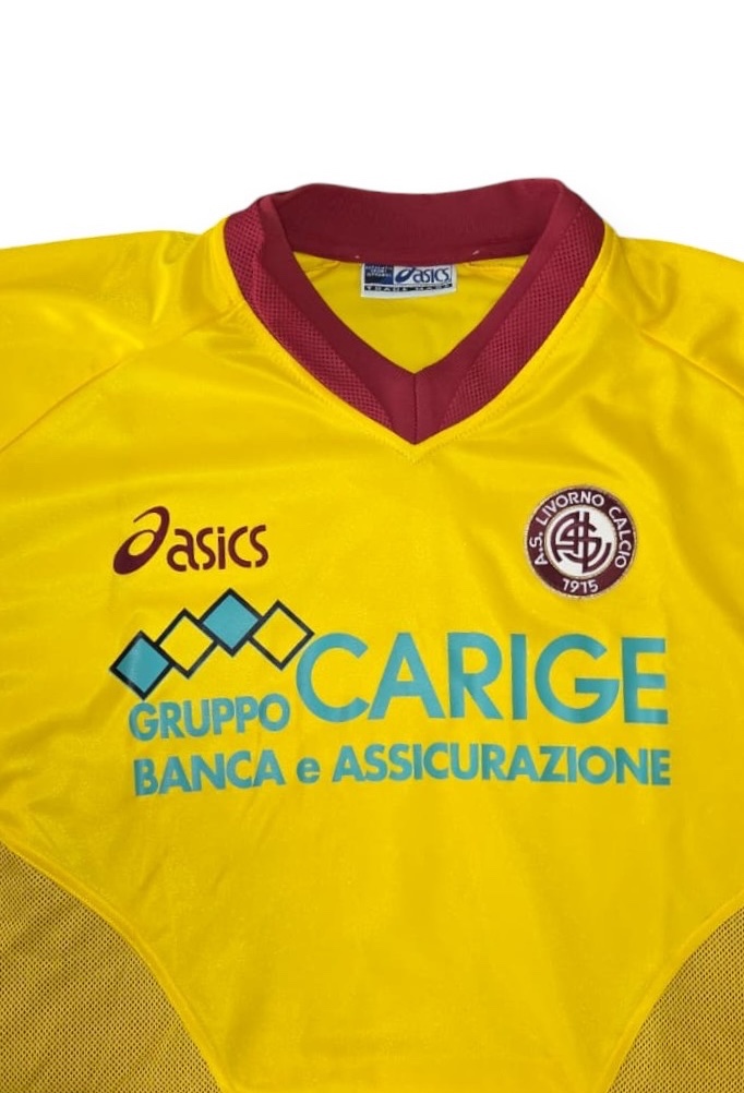 Maglia del Livorno stagione 2004/2005, versione Store, personalizzata Protti 10, realizzata da Asics, colore giallo con dettagli amaranto.