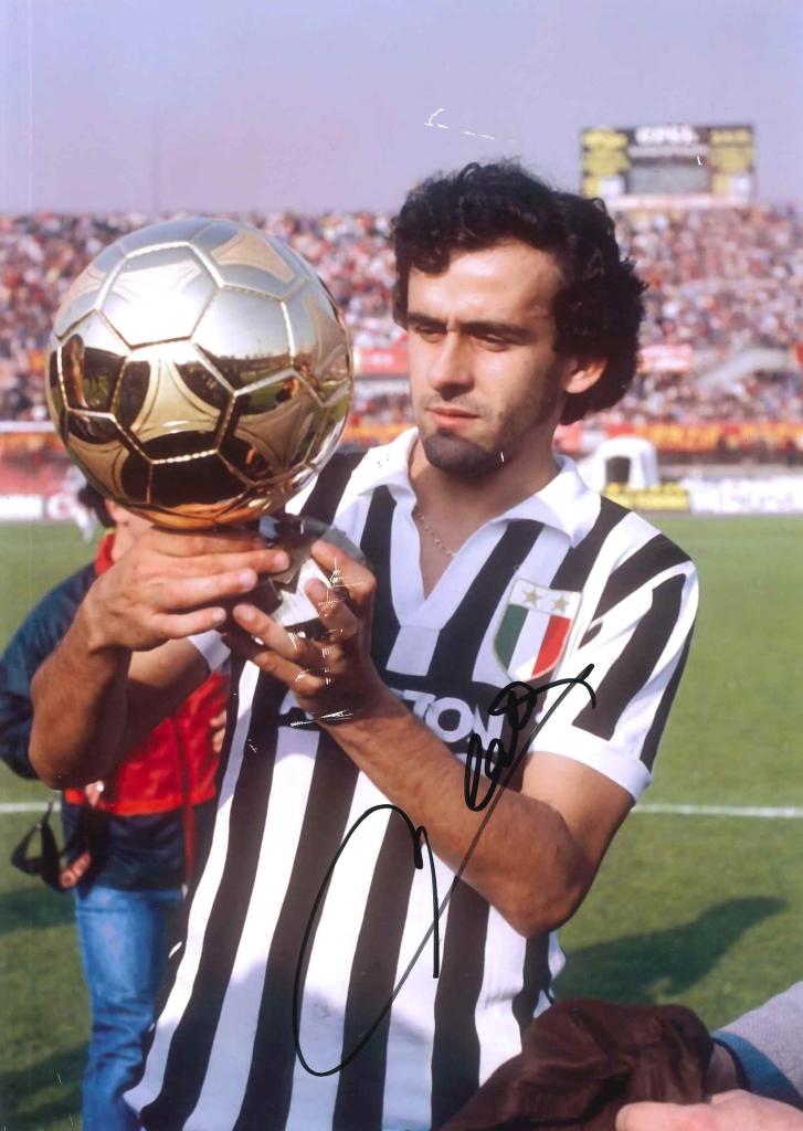 Foto anni ’80: Platini con Pallone d’Oro, maglia Juventus home 1984/85 (Ariston) e stemma tricolore 2 stelle. Firma in calce. Per collezione