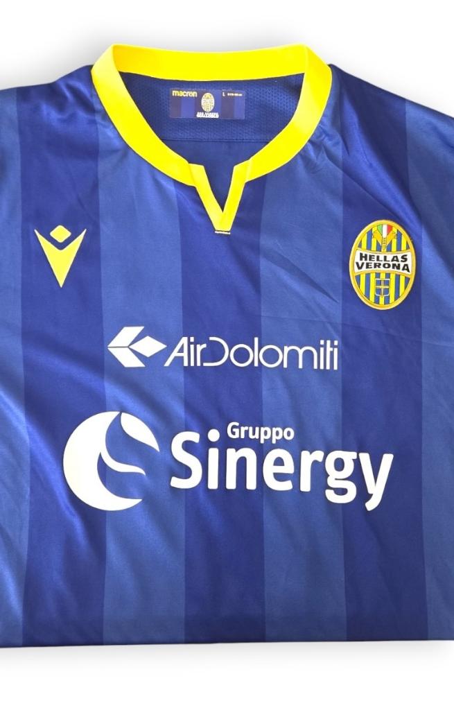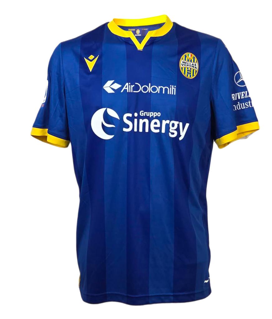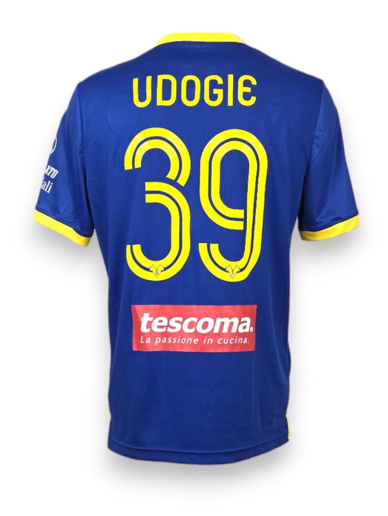 Maglia Home dell’Hellas Verona stagione 2019-2020, versione Player Issued personalizzazione Udogie 39, con patch Serie A.