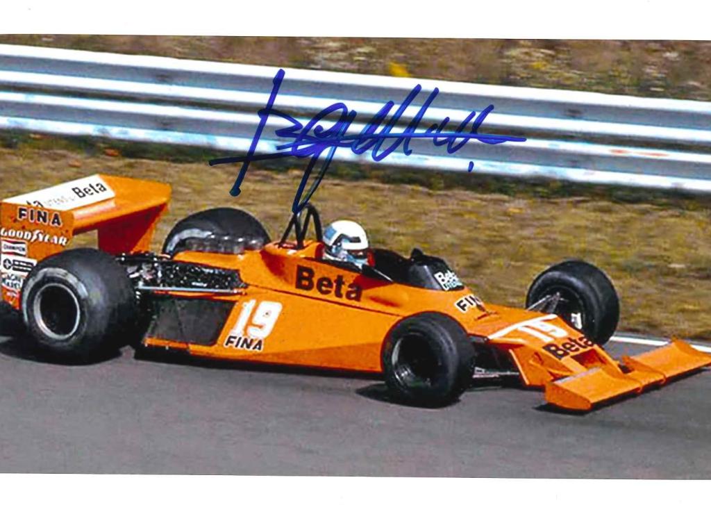 Autografo di Beppe Gabbiani su fotografia a colori che lo ritrae in azione al volante della monoposto di Formula 1 Surtees TS20 con livrea arancione Beta.