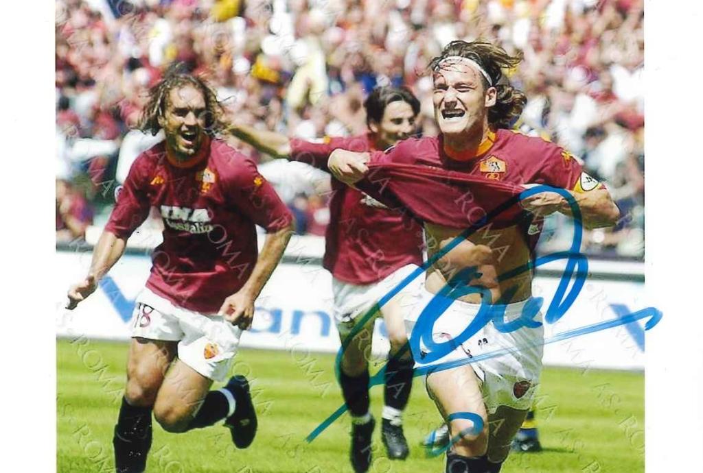 Fotografia autografata collegata alla carriera romanista di Totti, di interesse per collezioni dedicate alla AS Roma e ai protagonisti del calcio italiano contemporaneo.