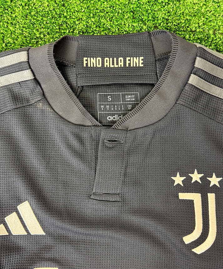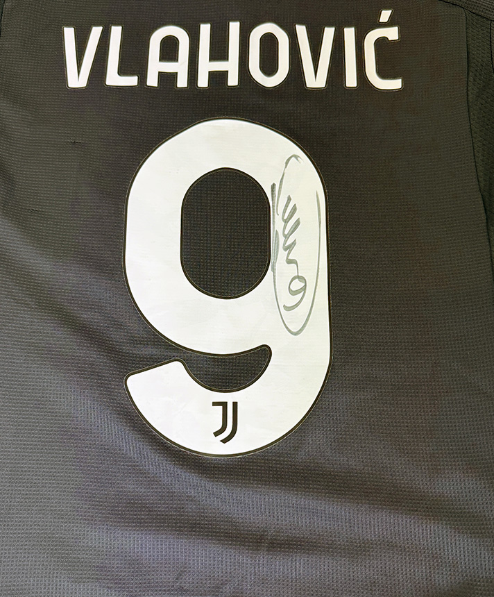 Autografo di Vlahovic su maglia Third della Juventus stagione 2023-2024, versione Store con patch ufficiale di Serie A.