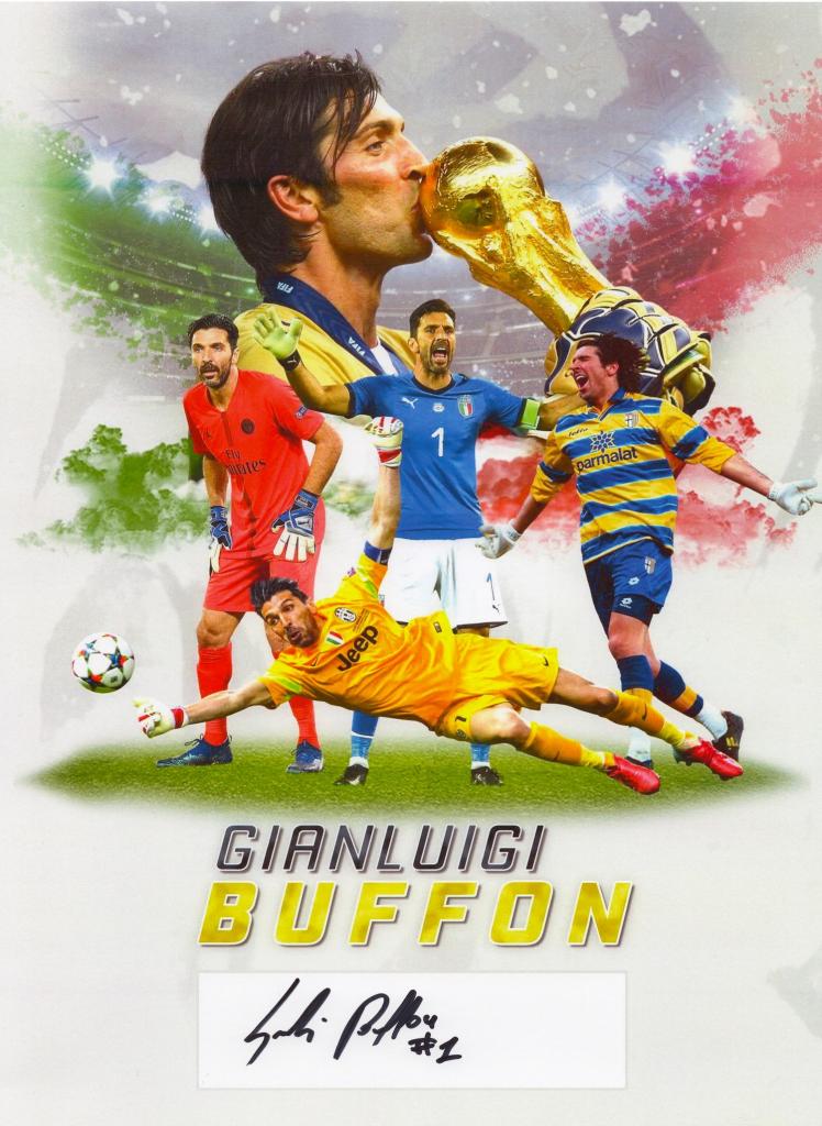 Poster che raffigura Buffon con tutte le maglie che ha indossato: Parma, Paris Saint-Germain, Juventus e con la nazionale italiana con Coppa del Mondo vinta nel 2006.